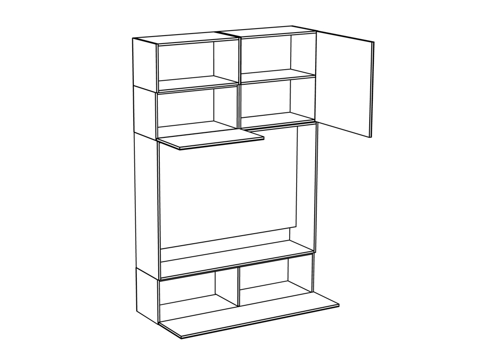 Шкаф для телеаппаратуры. В нижней части шкафа отделение с откидной дверью, разделенное на две равные части. Сверху располагаются два отделения: правое с распашной дверью оборудовано полкой, левое с откидной дверью. Над левым отделением установлена ниша.